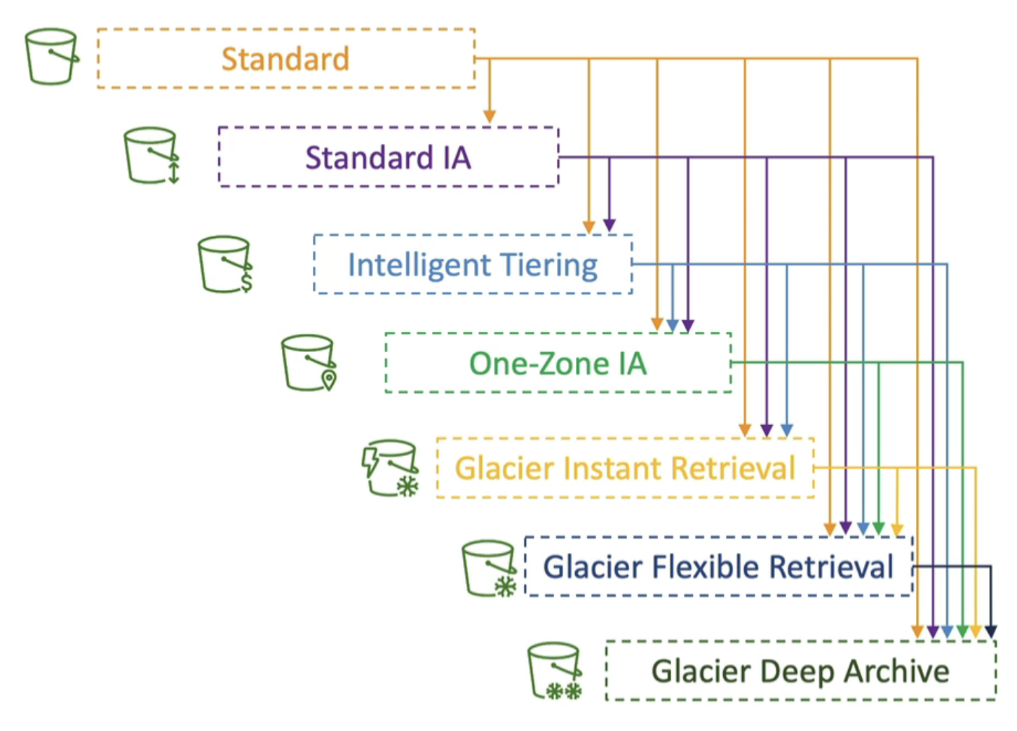 - 객체에 자주 액세스하지 않을 것을 알고 있다면 표준-IA로 이동하고, 객체를 아카이브(보관)할 예정임을 알고 있다면 Glacier 계층이나 Deep Archive 계층으로 이동해야한다.