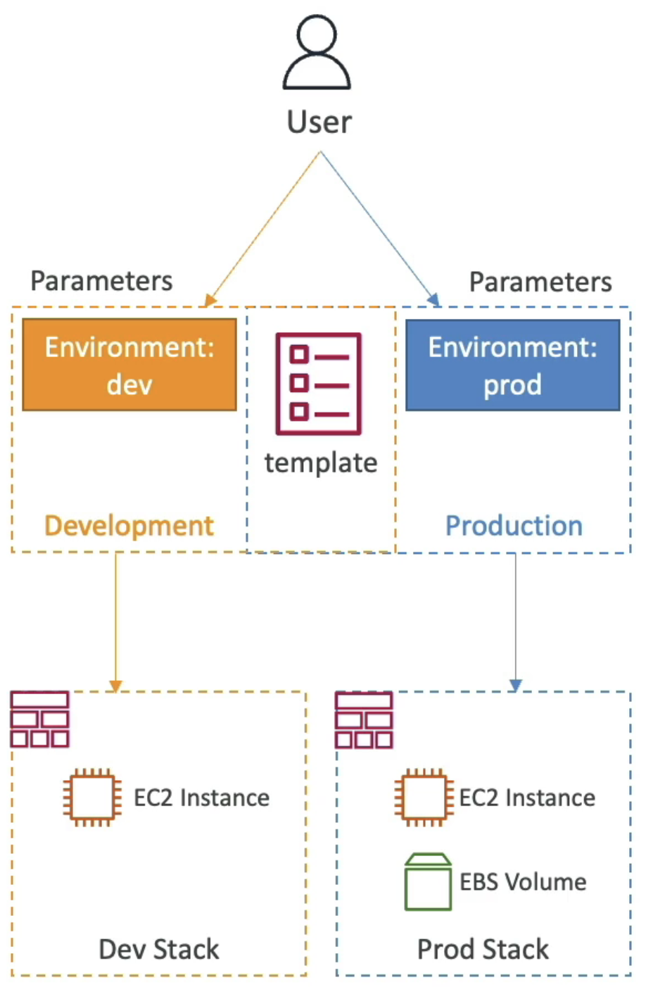 - 예를 들어 내포낸 출력(VPC ID)이 있는 네트워크 스택을 연결할 수 있고, 다른 애플리케이션 스택에서 내보낸 출력 값을 참조할 수 있다.