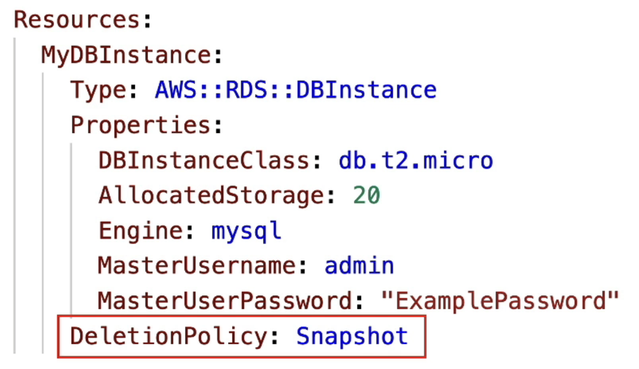 - DeletionPolicy=Snapshot은 삭제되기 직전에 스냅샷을 만들며, EBS Volume, ElastiCache Cluster, RDS DBInstance, RDS DBCluster에만 적용된다.