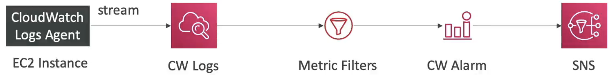 - CloudWatch Logs Metrics Filters에 알람을 생성할 수 있다.