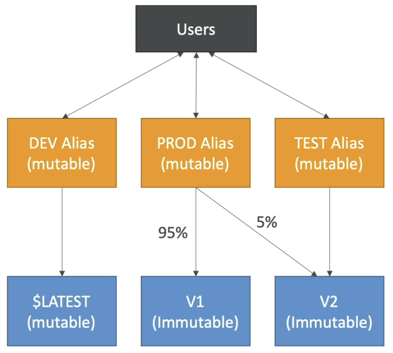 - 별칭은 자신의 고유한 ARN을 가지지만, 별칭은 다른 별칭을 참조할 수 없다.