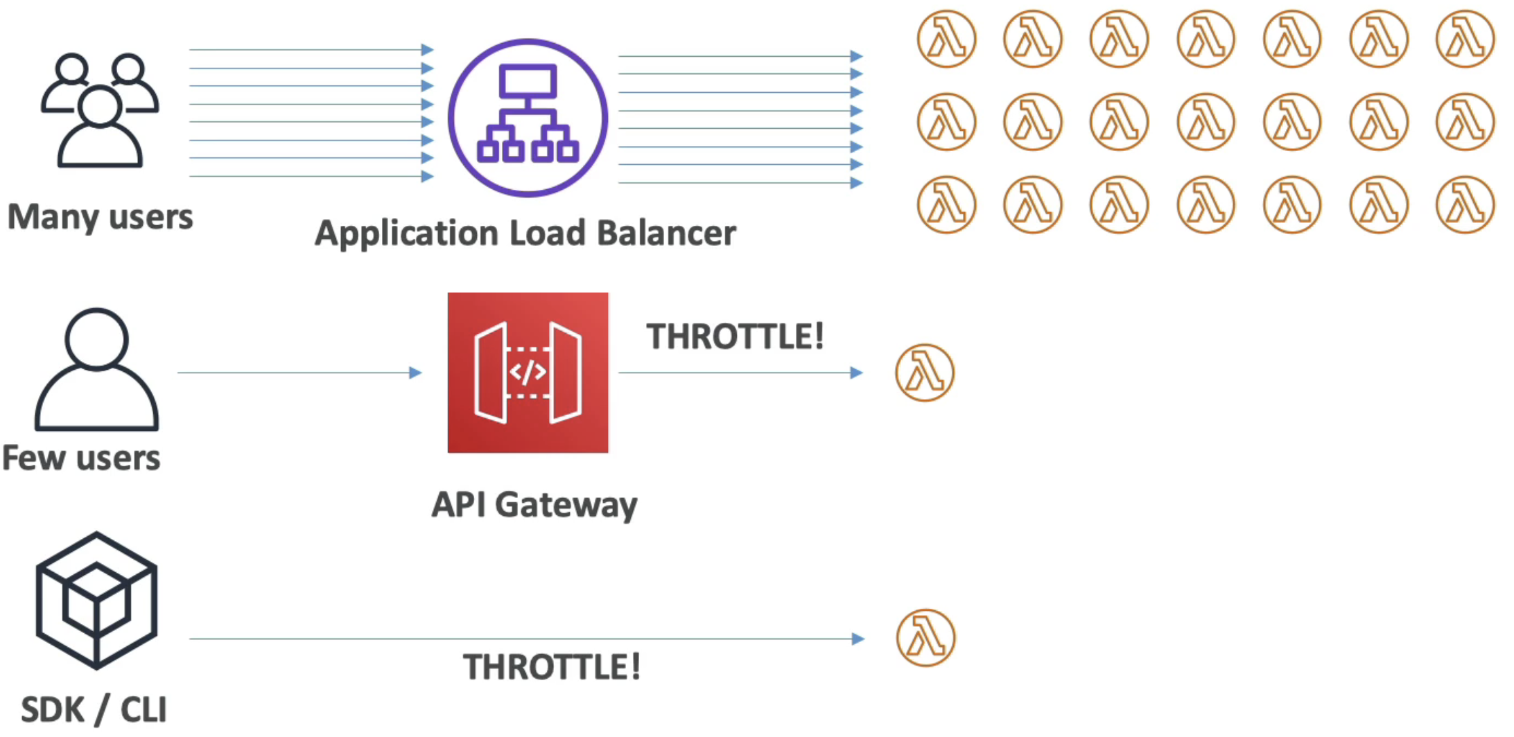 - 만일 스로틀링이 필요하다면, 람다의 예약된 동시성을 사용하여 람다 함수 실행량을 조절할 수 있다.