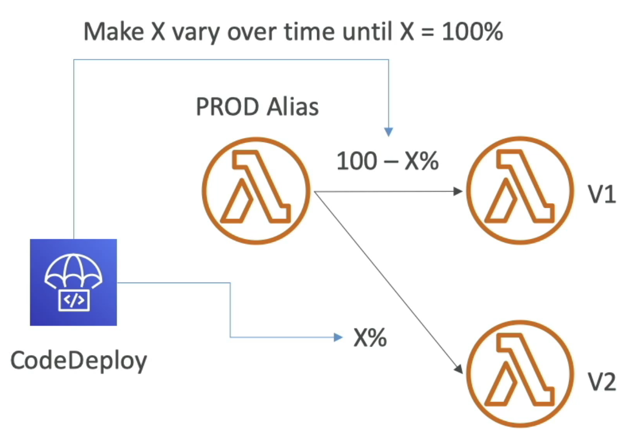 - CodeDeploy를 사용하면 람다 별칭에 트래픽 이동을 자동화할 수 있다.