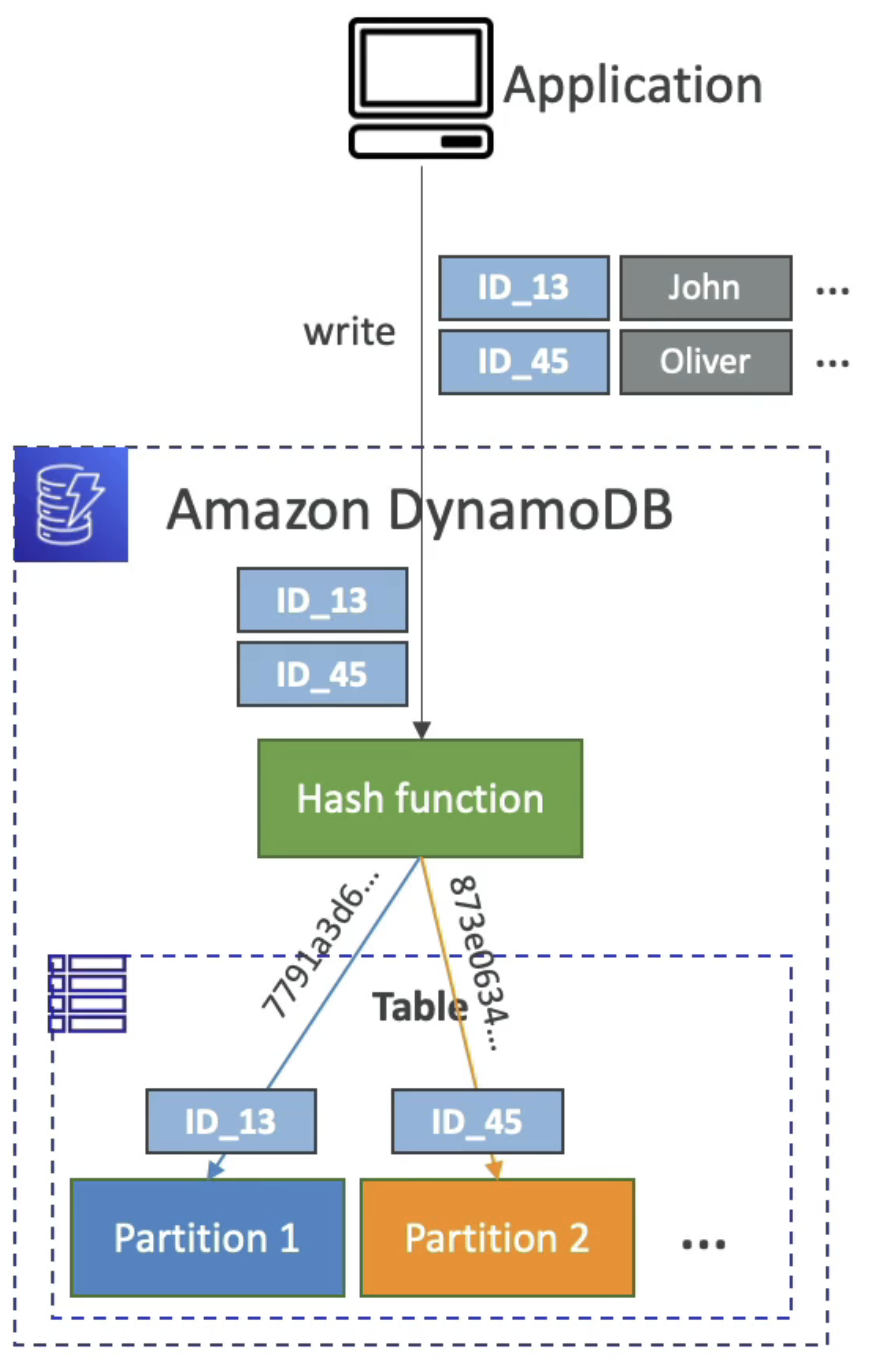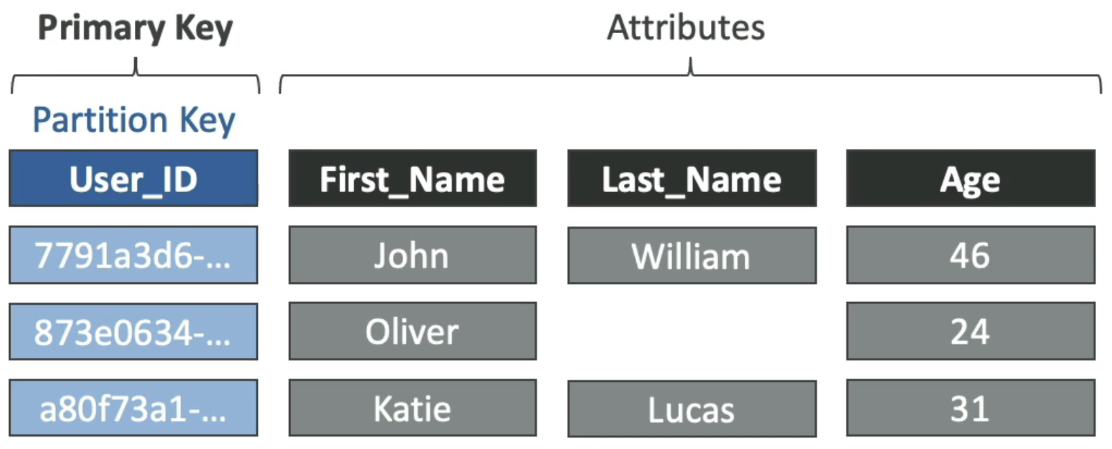 - DynamoDB는 테이블들로 이루어져 있으며, 각각의 테이블은 기본 키를 갖는다.
