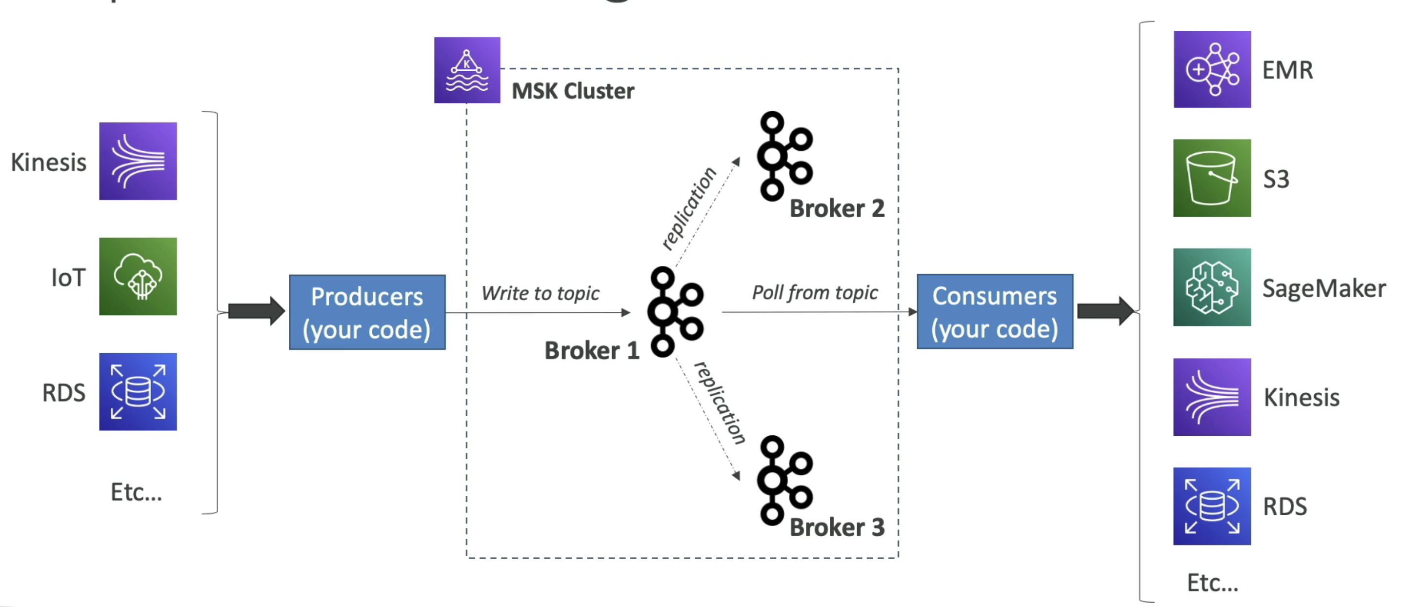 - MSK를 사용하면 AWS에서 완전관리형 Kafka 클러스터를 구성할 수 있고,