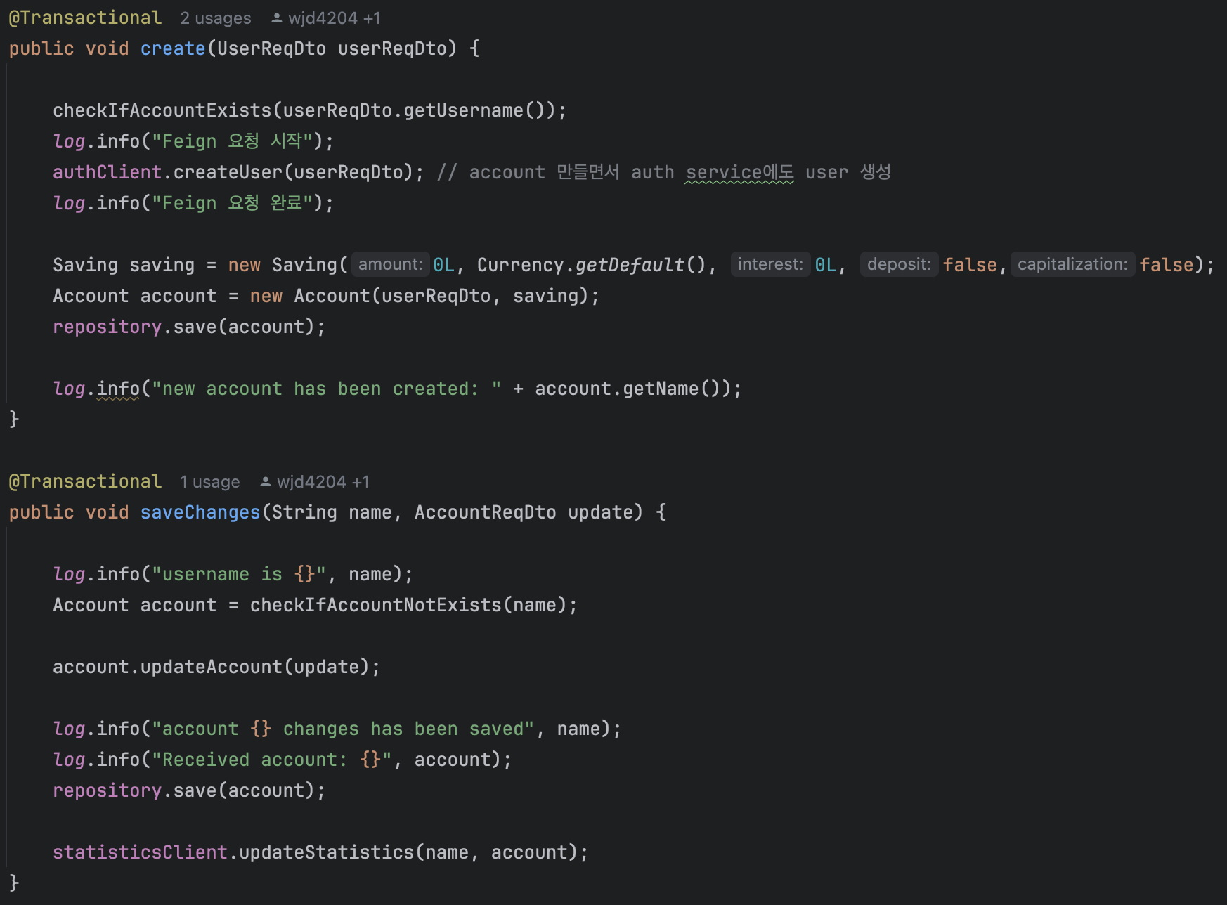 - 다음은 Account Service의 유저 생성과 데이터 변경에 대한 메서드들이다.