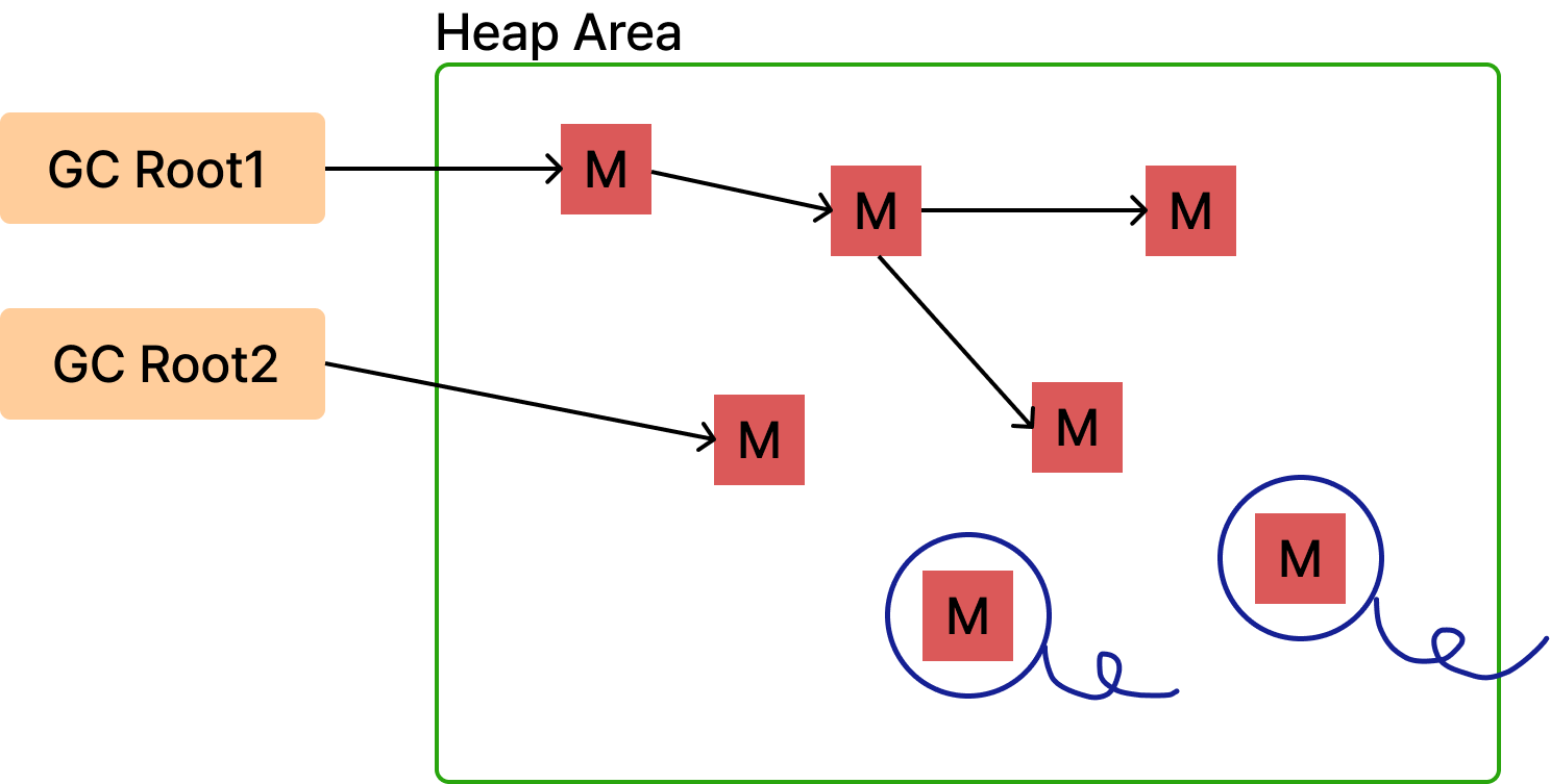 GC에는 GC Root라는 힙 외부에서 접근할 수 있는 변수나 오브젝트가 있다. 이 GC Root부터 시작하여 참조(연결)되는 오브젝트로 점점 뻗어나가게 되는데 이것이 바로 Mark이다.