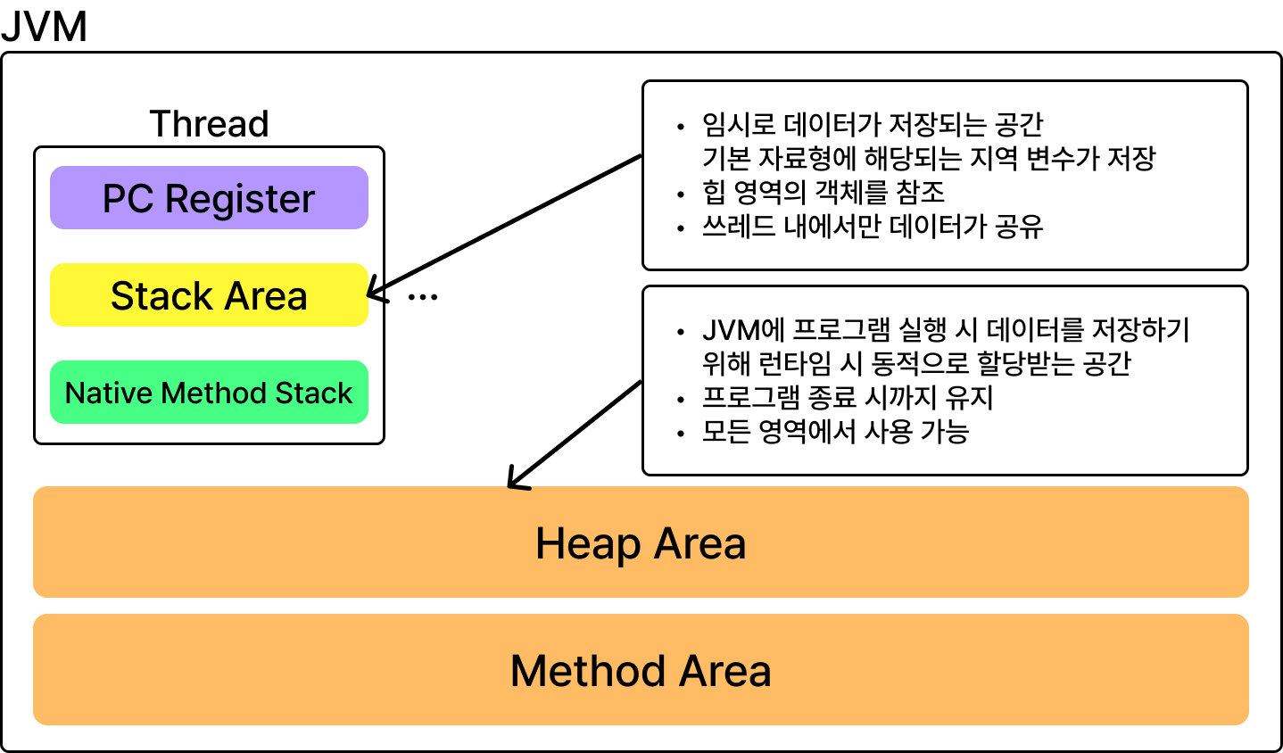 - Reference 타입만을 저장하며, 힙 영역에 있는 오브젝트들을 가리키는 참조 변수는 스택 영역에 적재된다.