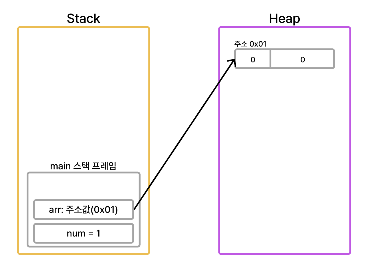 arr 배열 변수의 실제 데이터는 heap 영역에 저장되어 이를 참조할 주소값을 지니게 된다.