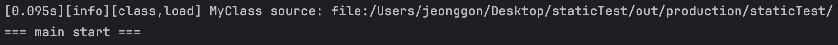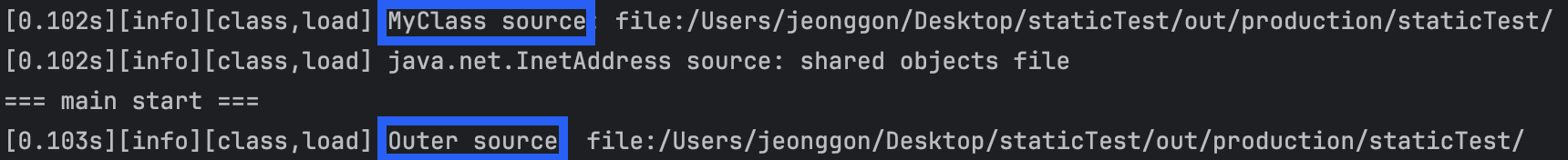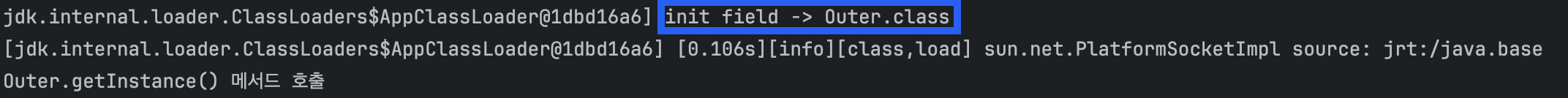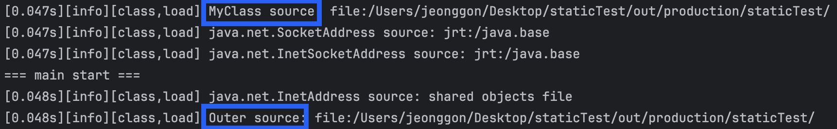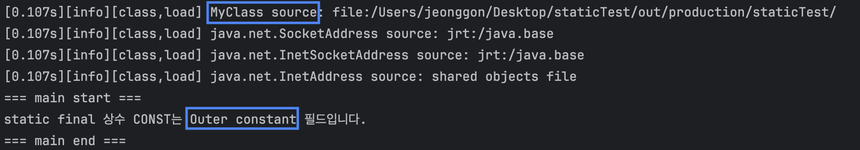 main 메서드가 실행되자 MyClass를 할당하고 Outer 클래스가 로드되어 static 필드를 출력한다.