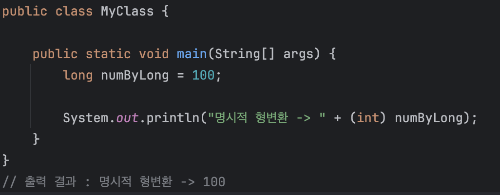 아래의 코드처럼 명시적으로 작성을 해준다면 강제 형변환이 일어나게 된다.