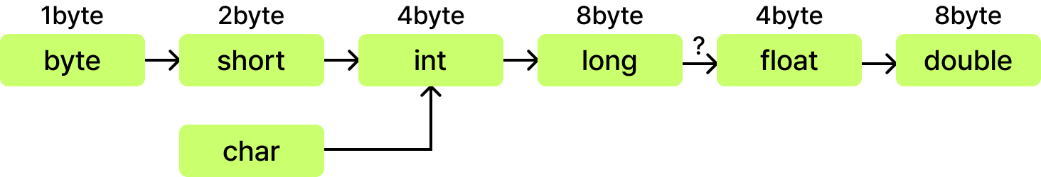 타입 변환에는 규칙이 존재한다. 메모리에 할당받은 바이트의 크기가 상대적으로 작은 타입에서 큰 타입으로의 변환은 생략할 수 있다.