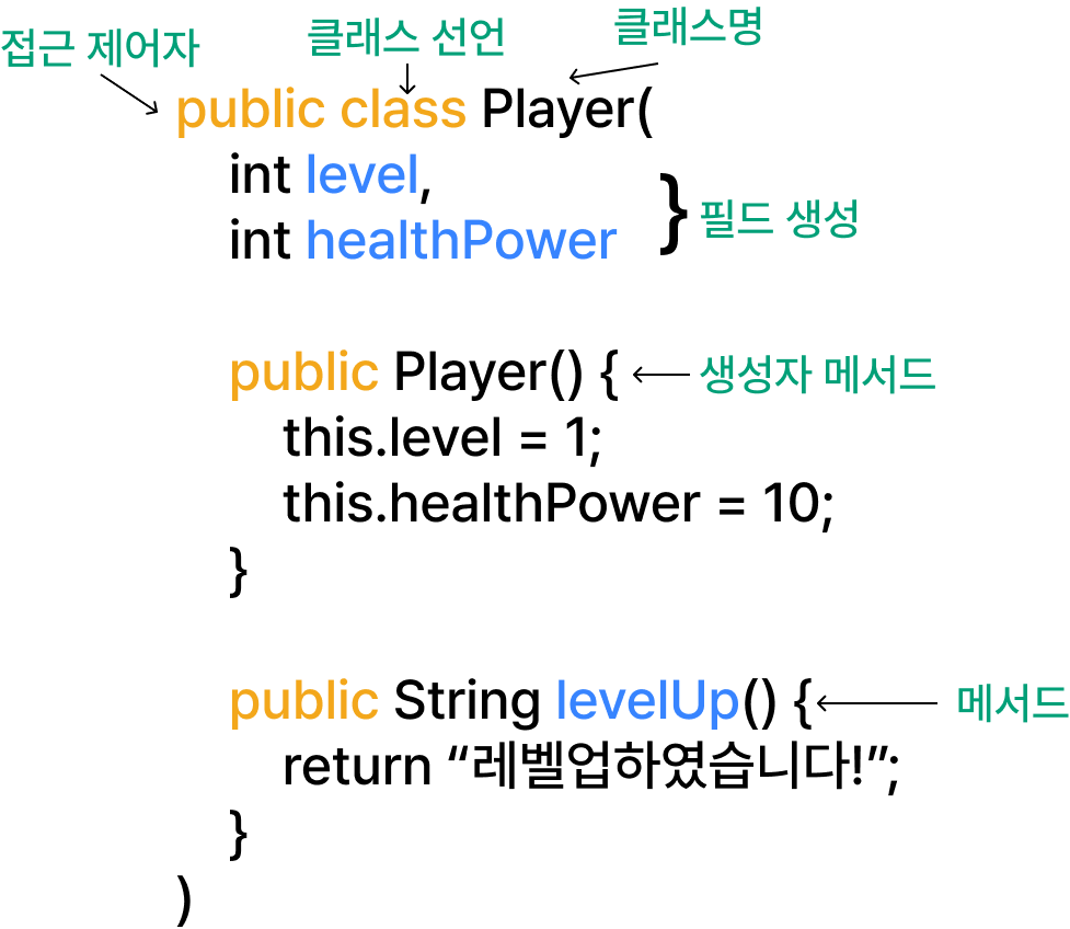 이 설계도가 "클래스"이고, 설계도로 만들어진 실제 플레이어가 "객체"다.
